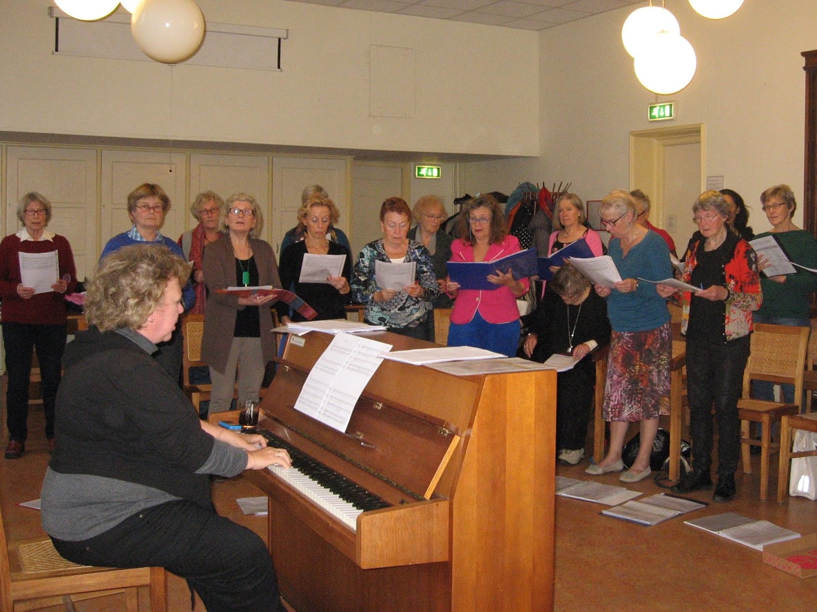 Iedere woensdagmiddag komen we met veel plezier weer naar het Rosenstock-Huessy Huis om onder leiding van onze geduldige dirigente Carole tussen 14.30 en 16.30 uur te oefenen. Maar voordat zij de toetsen van de piano kan bespelen moet er het een en ander gebeuren. Met vereende krachten wordt de grote tafel aan de kant geschoven, de stoelen neergezet en de piano op de juiste plaats geschoven. En dan kan het feest beginnen.